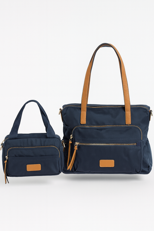 Bolso shopper azul marino con bolsillo frontal y asas marrones