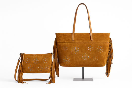 Bolso shopper de ante camel con flecos laterales y tachuelas