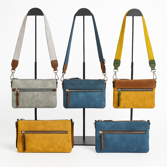 Bolso bandolera mostaza y marrón con cremallera y correa mostaza