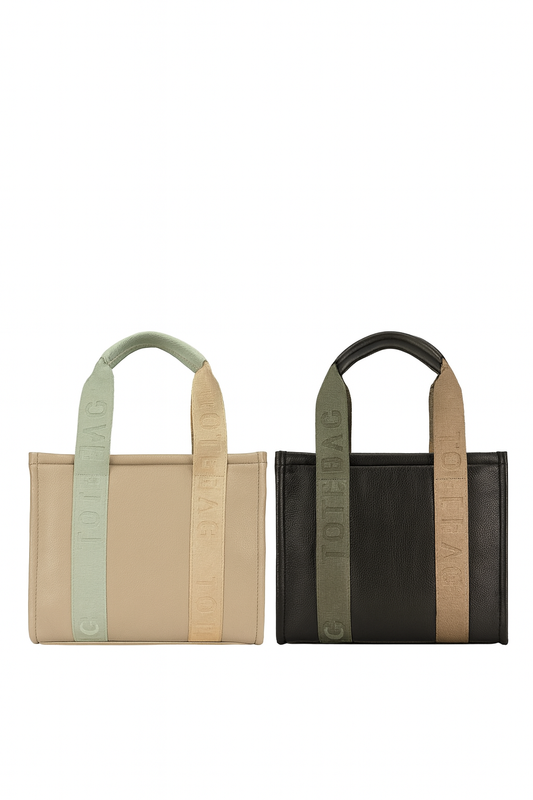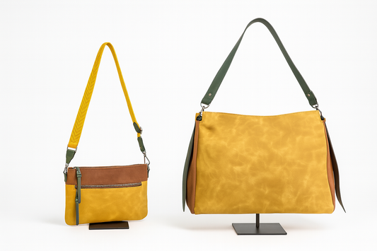 Bolso bandolera mostaza con detalles marrones y asa verde
