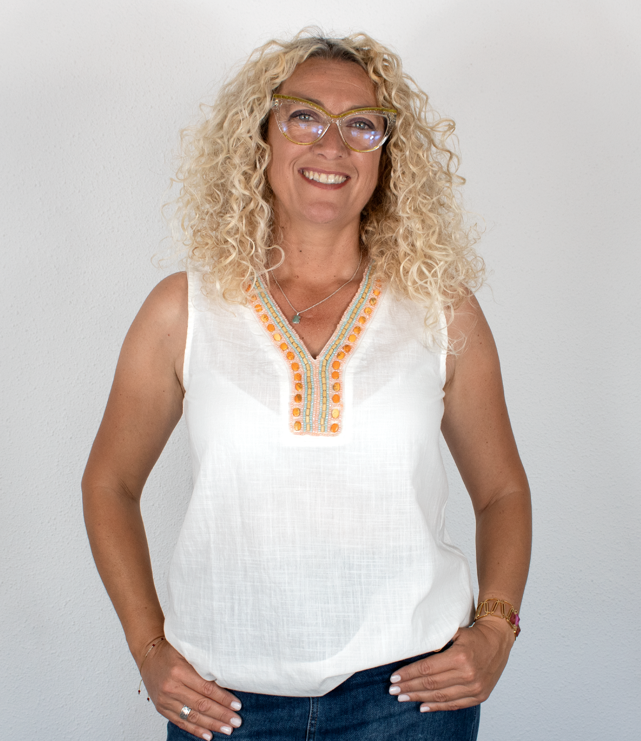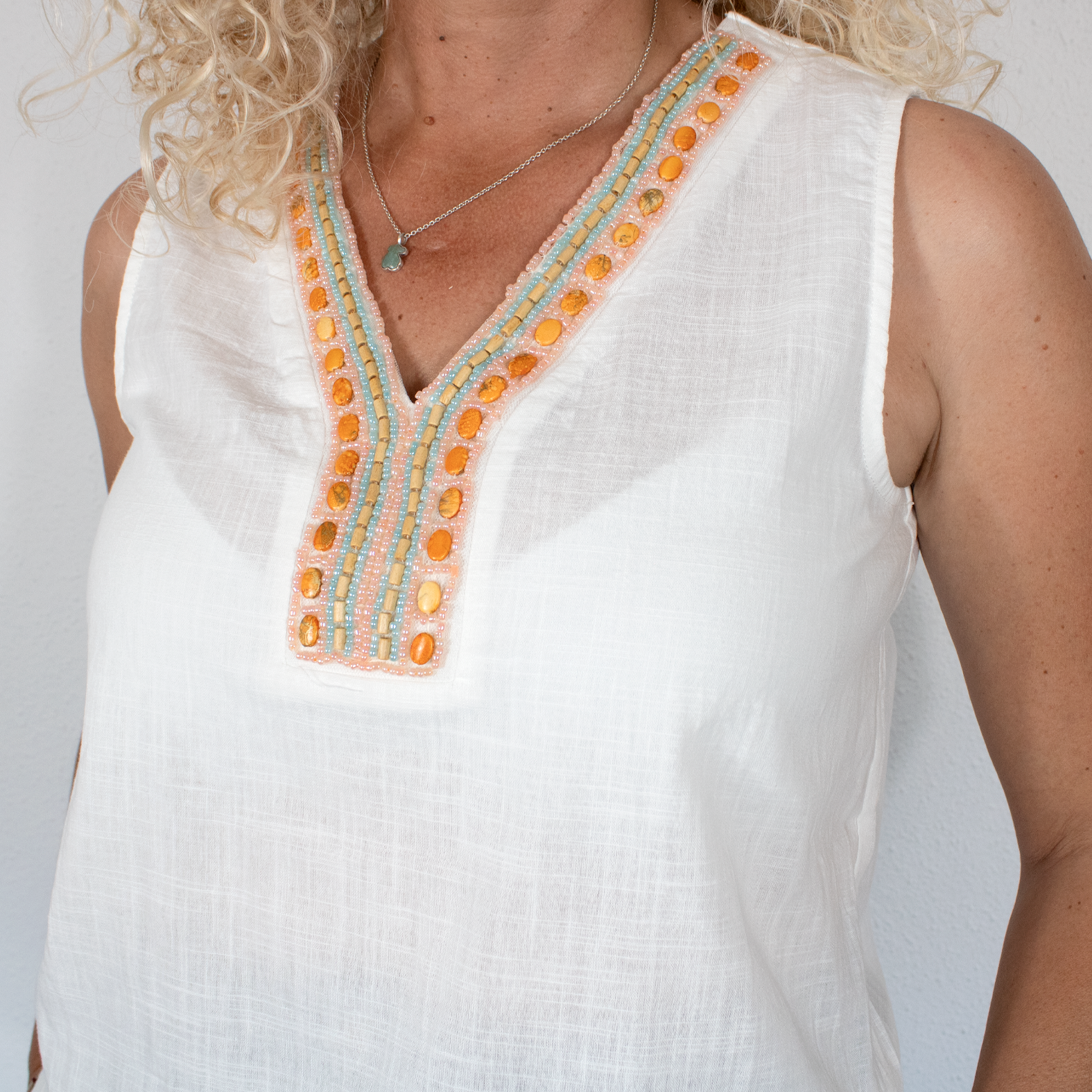 Esta blusa de mujer sin mangas combina frescura y estilo con un diseño elegante y ligero. Su color blanco resalta los detalles en tonos naranja y azul que decoran el escote en forma de "V", aportando un toque artesanal y único. Confeccionada en una tela liviana, es ideal para climas cálidos y looks relajados, perfecta para combinar con jeans o faldas. Un básico imprescindible con un aire bohemio y sofisticado.