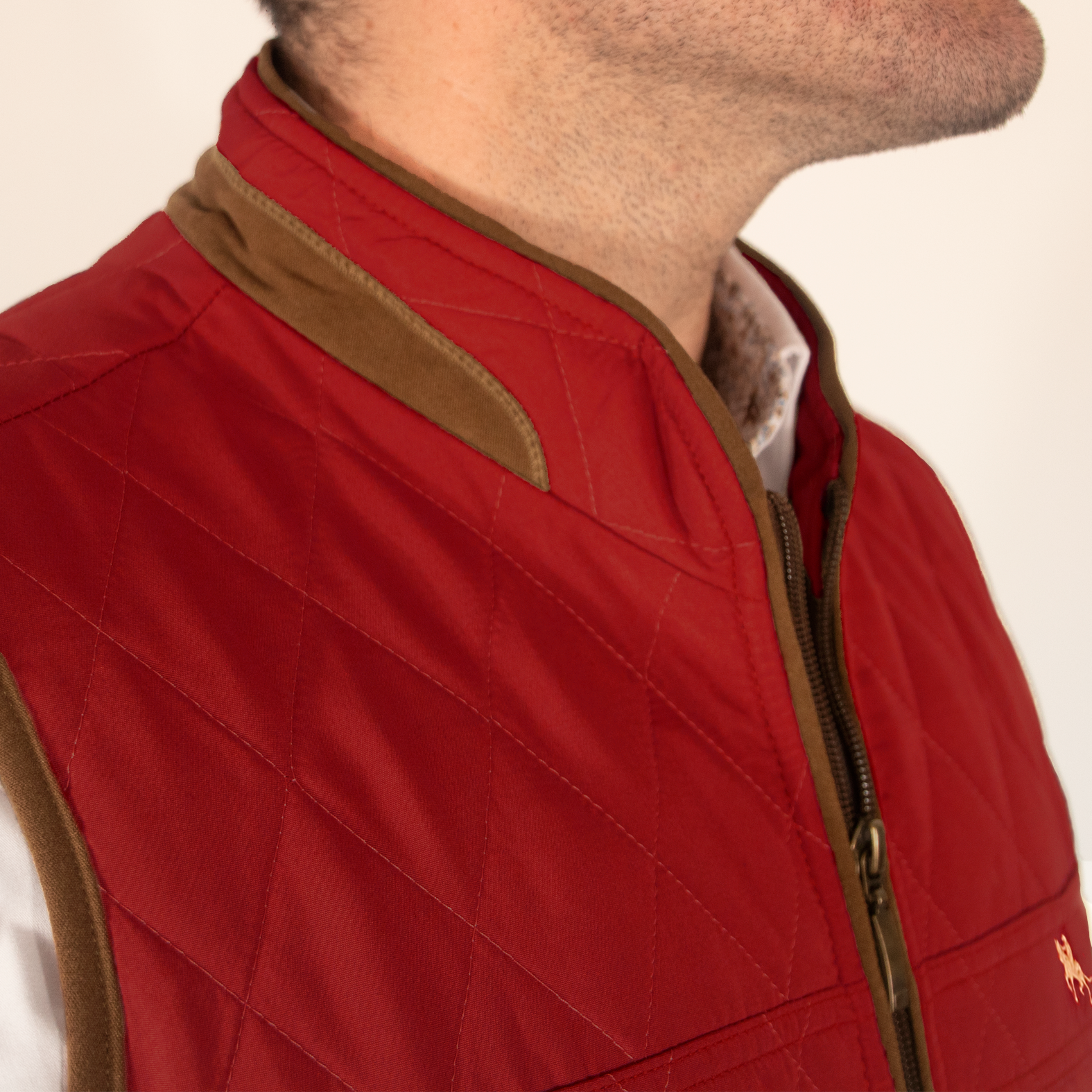 Chaleco de hombre de vestir con cuello alto, acolchado y tejido en forma de rombos.