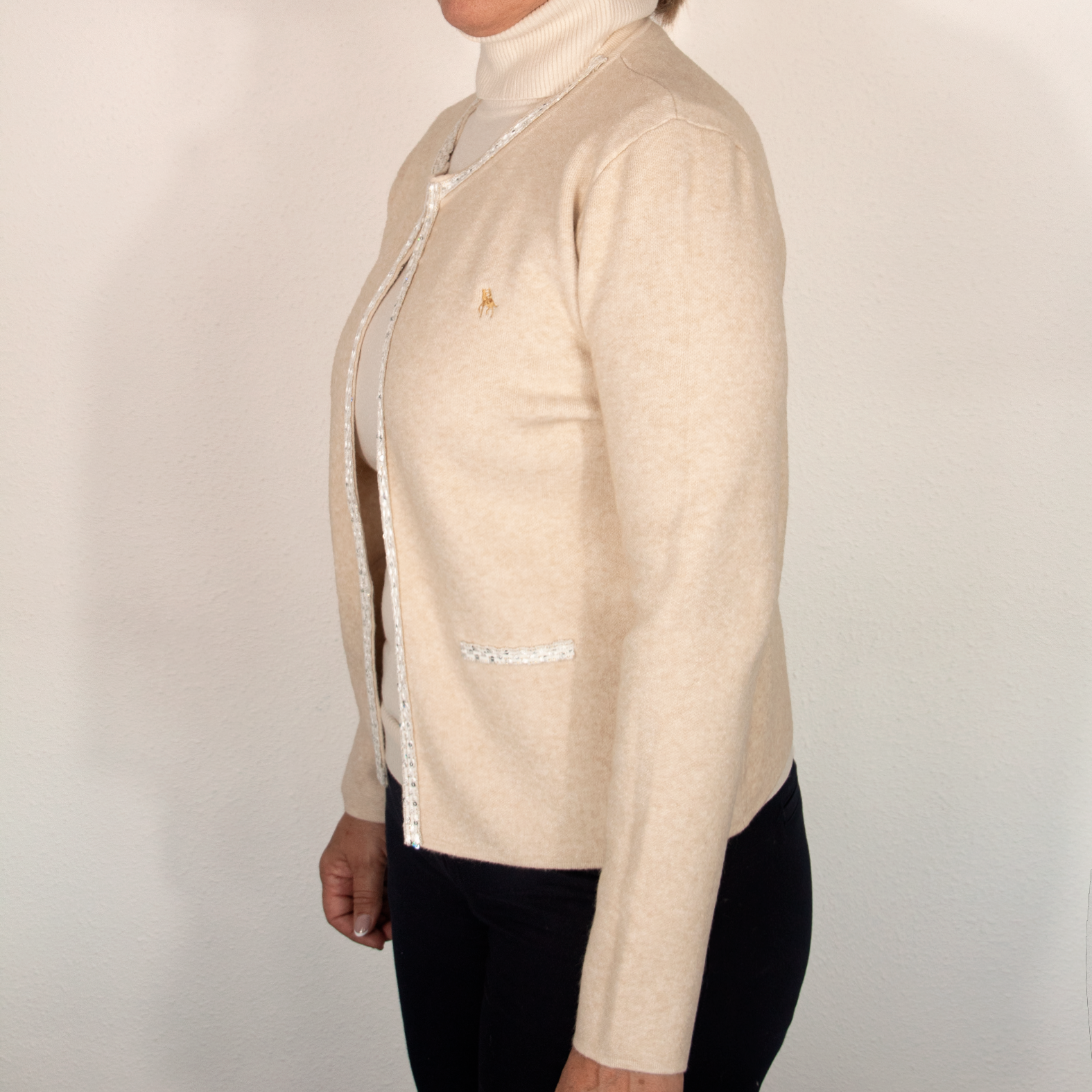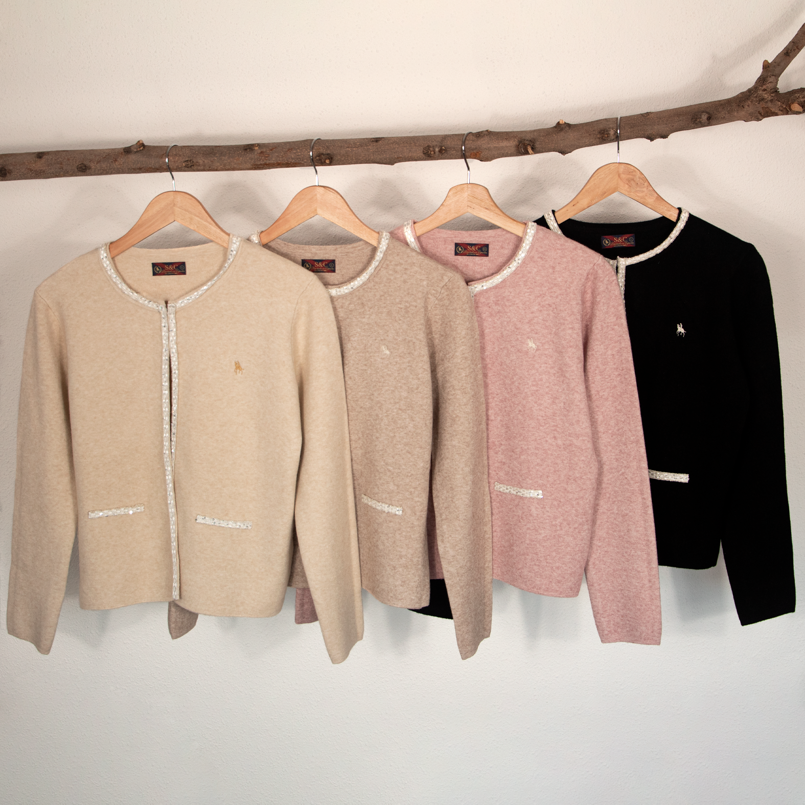 - Chaqueta de punto para mujer con bordes en brillo que añaden un sutil toque de glamour, haciendo que esta chaqueta destaque en cualquier ocasión, desde eventos formales hasta looks casuales con un toque elegante.