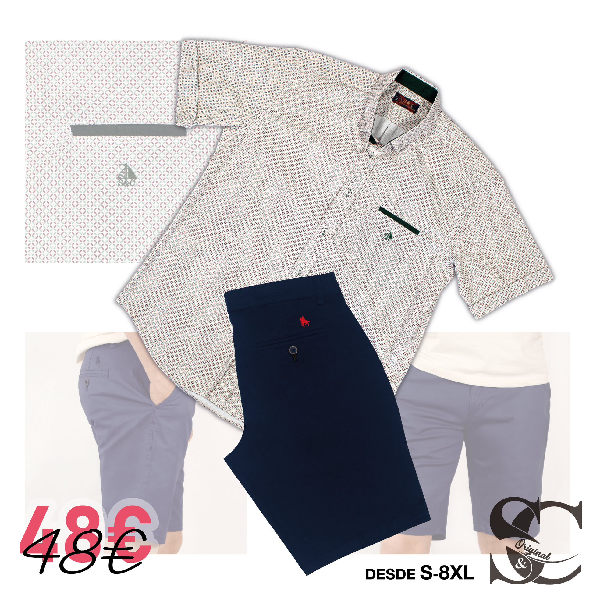 Conjunto camisa estampado verde y lila con bermuda marino