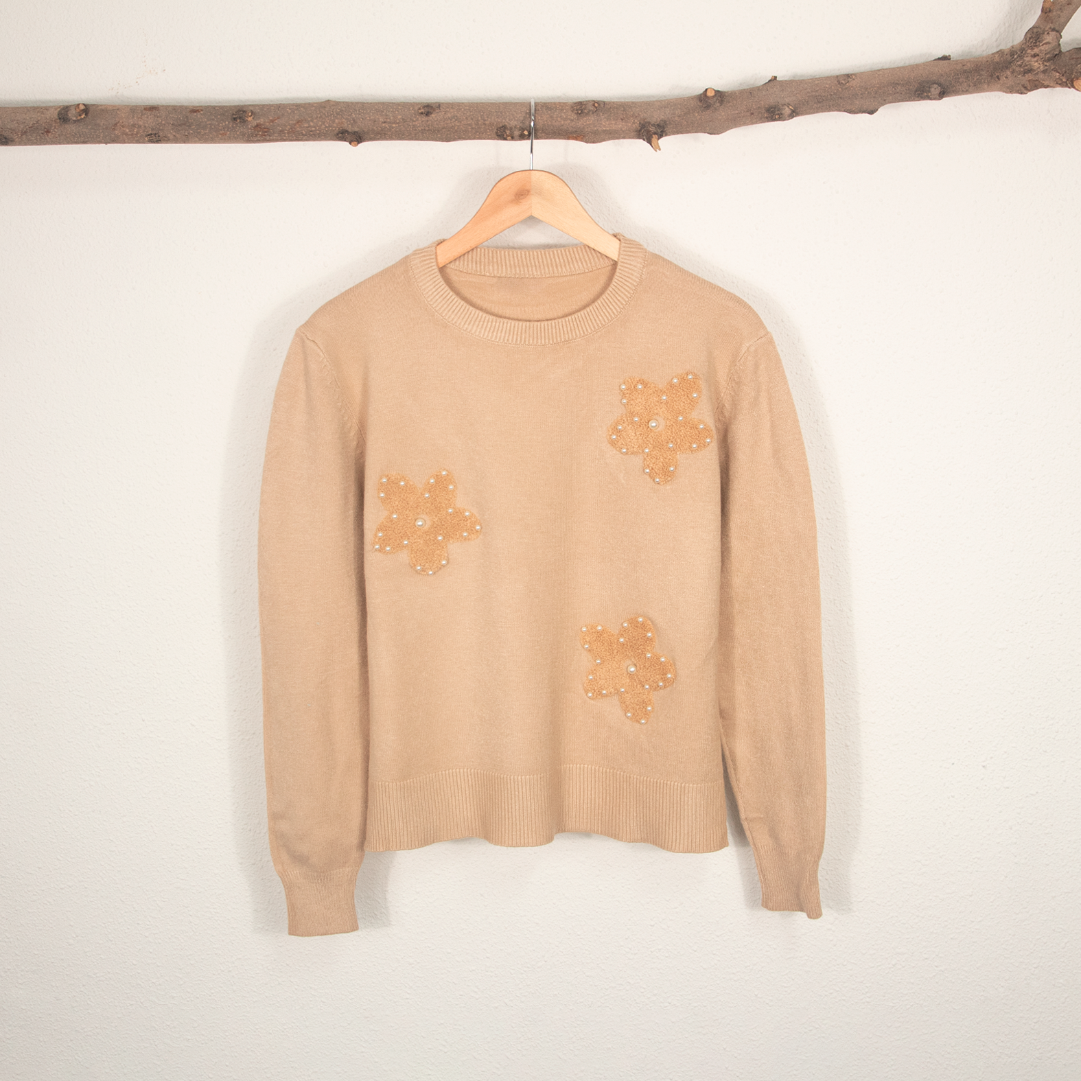 Jersey de Mujer de Manga Larga con Apliques de Flores y Detalles de Perlas