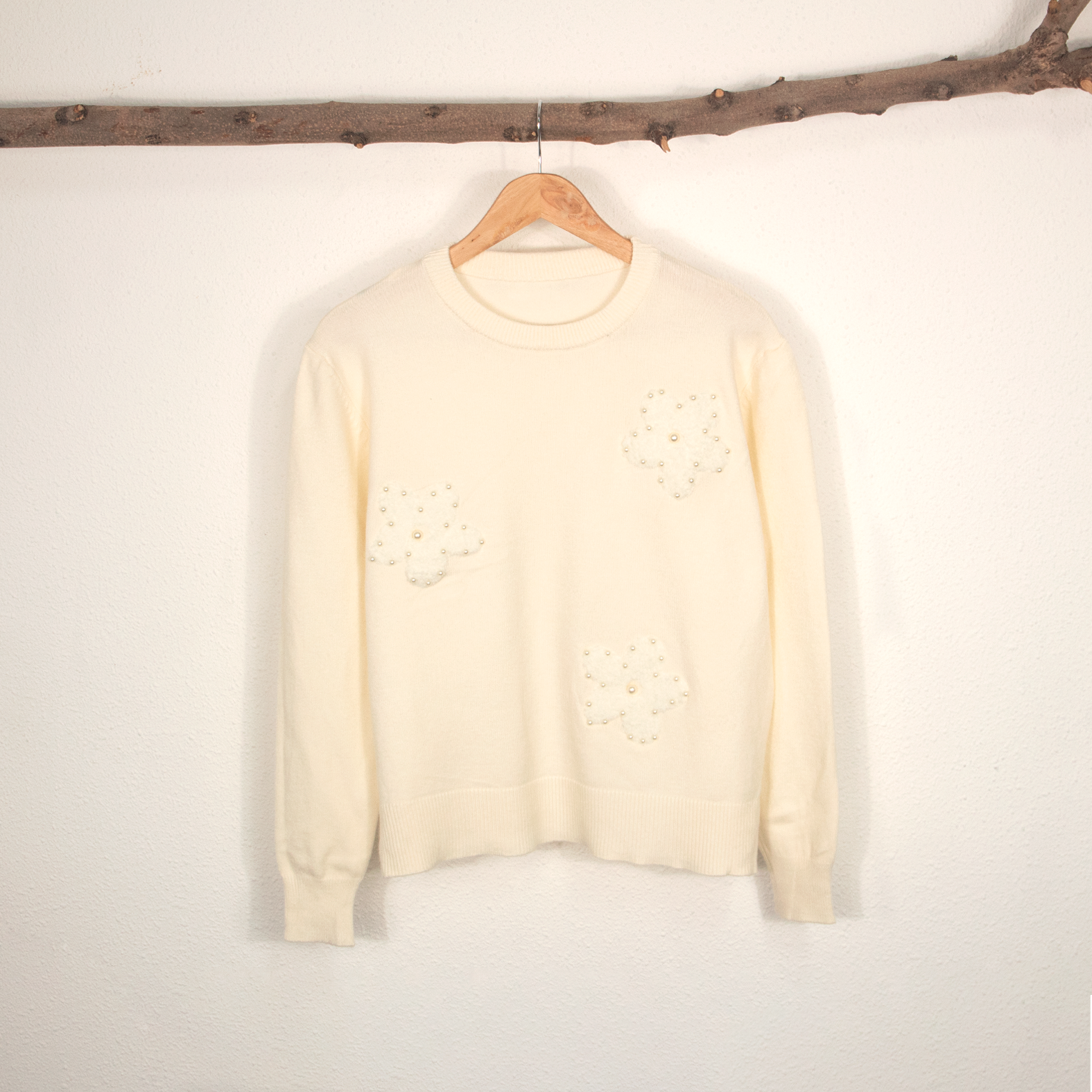 Jersey de Mujer de Manga Larga con Apliques de Flores y Detalles de Perlas