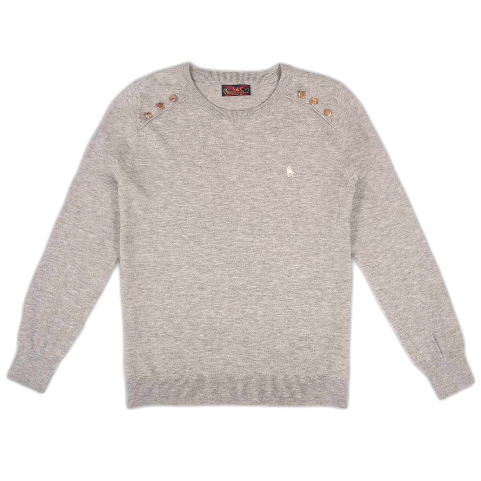 Este jersey es la combinación perfecta entre estilo y comodidad. Confeccionado en una suave mezcla de tejidos, cuenta con elegantes detalles de chapas doradas en los hombros, aportando un toque de distinción a cualquier look.