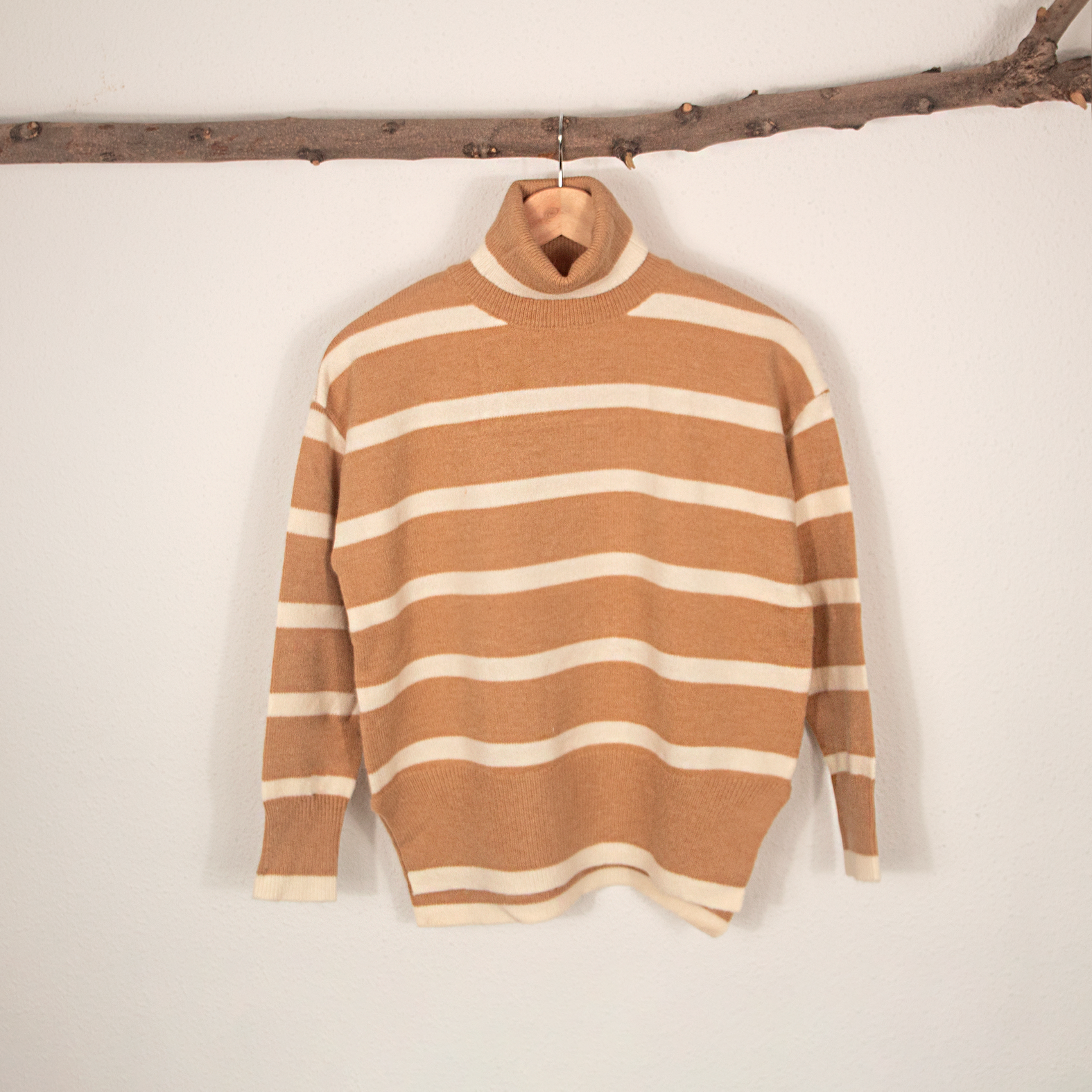 Este jersey de mujer de manga larga y cuello vuelto es la elección ideal para quienes buscan un estilo clásico y atemporal. Con un elegante diseño de rayas horizontales en tonos neutros y cálidos, esta prenda combina sofisticación y comodidad, perfecta para cualquier ocasión en climas frescos.