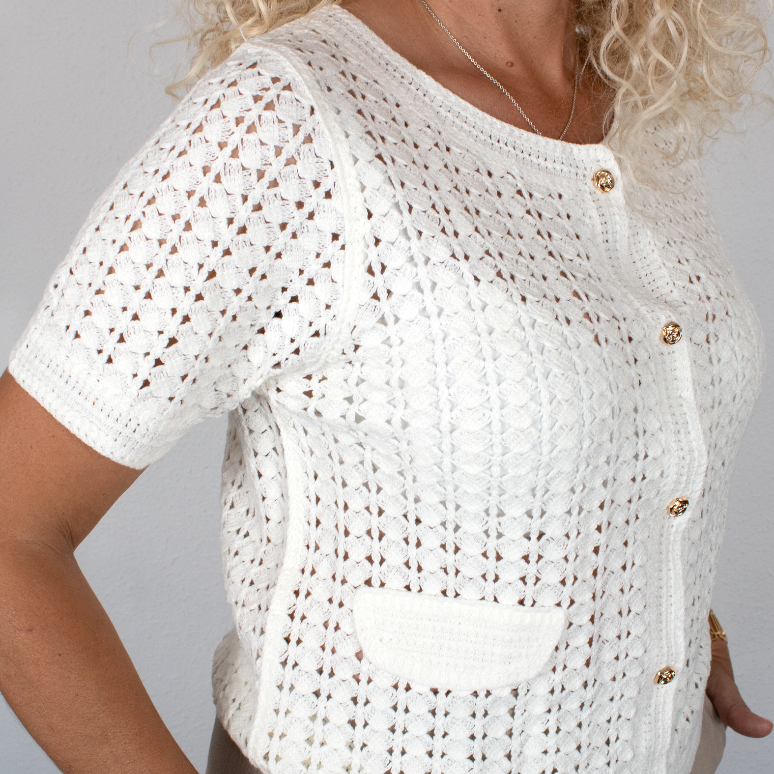 Este elegante jersey de mujer, en color blanco, está confeccionada en un tejido de punto calado que aporta un toque sofisticado y ligero. Su diseño de manga corta incorpora un delicado patrón de pequeños rombos, lo que la convierte en una prenda fresca y versátil. En la parte frontal, destacan una fila de botones dorados y un pequeño bolsillo decorativo, añadiendo un detalle chic y moderno. Perfecta para un look casual o más refinado según la combinación elegida.