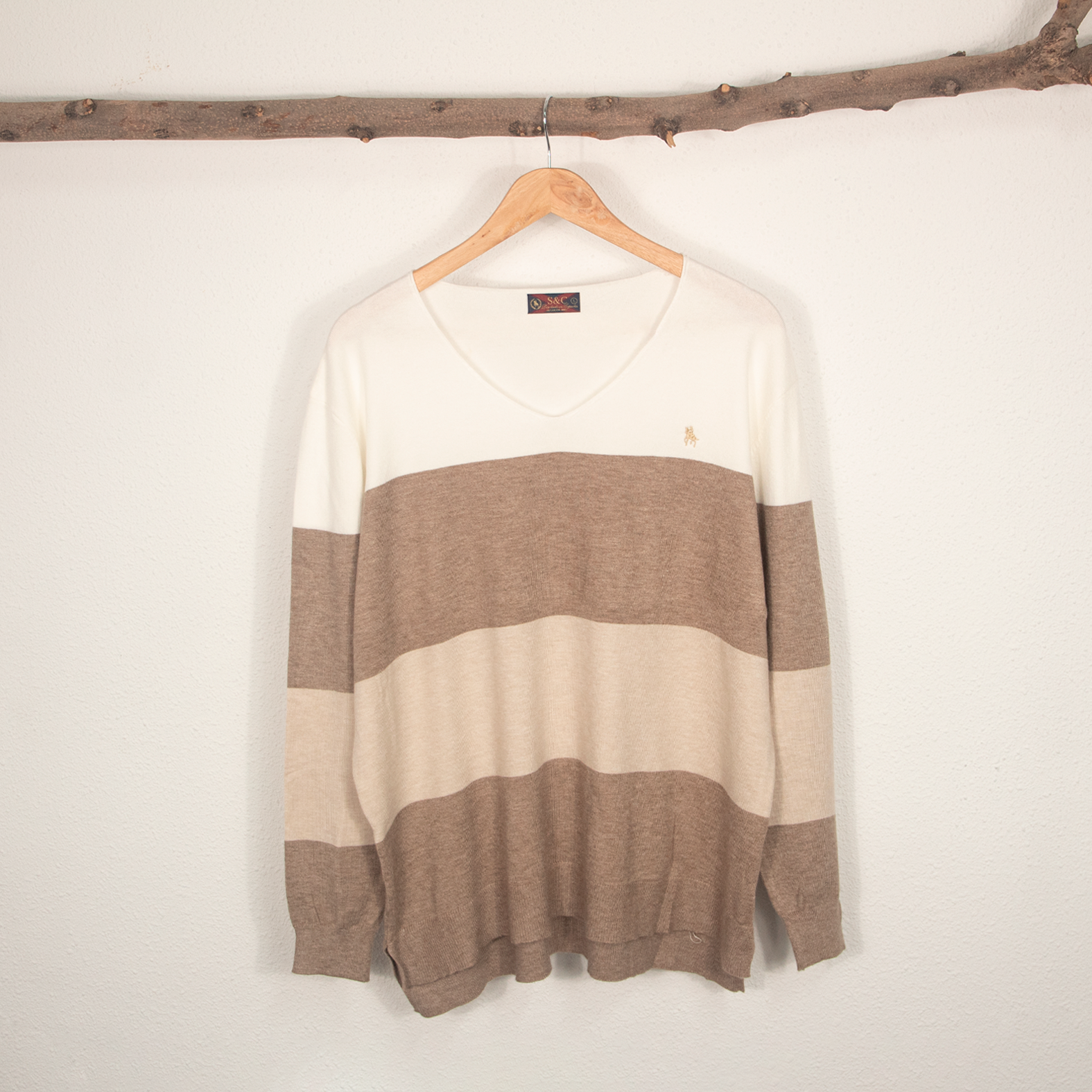 El diseño de rayas en bloques de color le da un toque visual atractivo, mientras que el cuello en V aporta un toque femenino y estilizado que alarga visualmente el cuello.