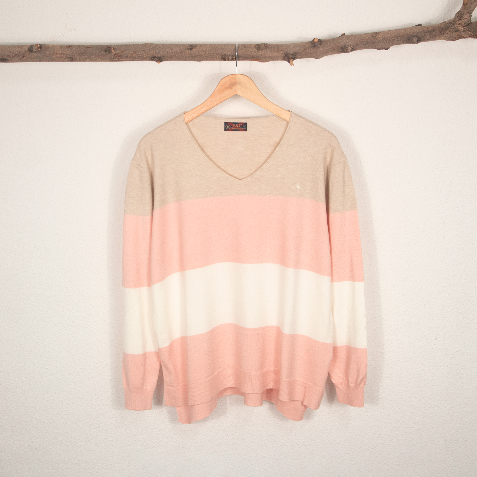 El diseño de rayas en bloques de color le da un toque visual atractivo, mientras que el cuello en V aporta un toque femenino y estilizado que alarga visualmente el cuello.
