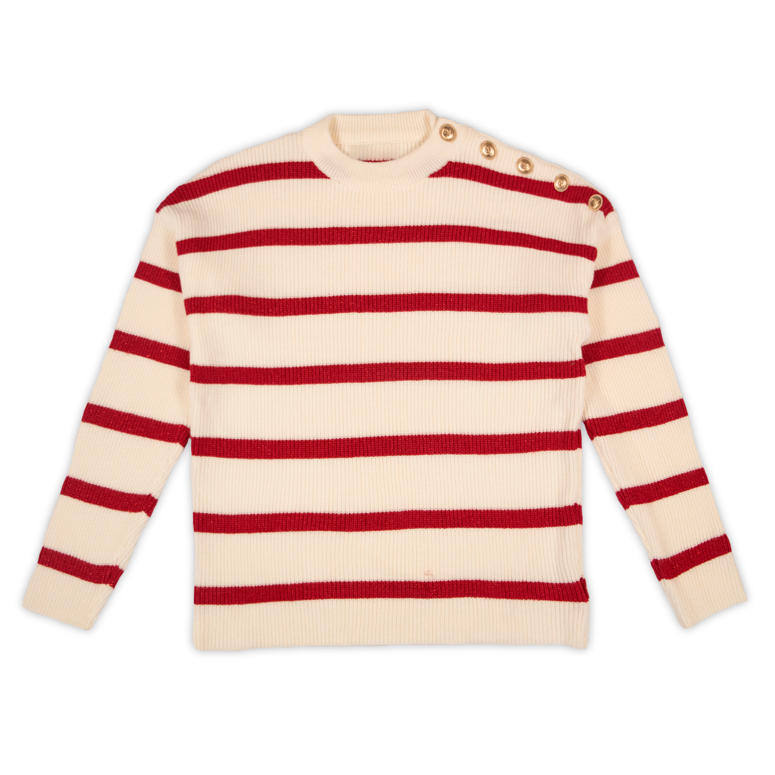 Fabricado con materiales de alta calidad, este jersey de rayas es ideal para crear looks casuales y modernos. El detalle distintivo de botones en el hombro añade un toque de sofisticación, haciendo de esta prenda una opción versátil para cualquier ocasión.